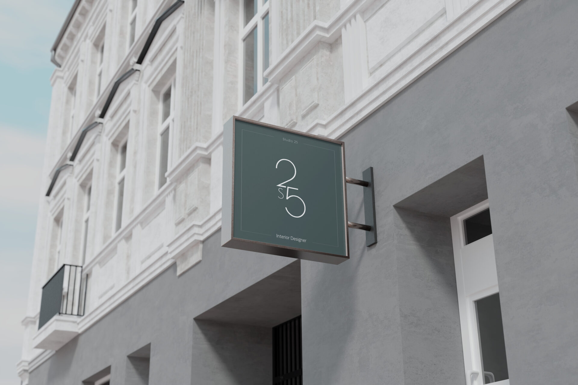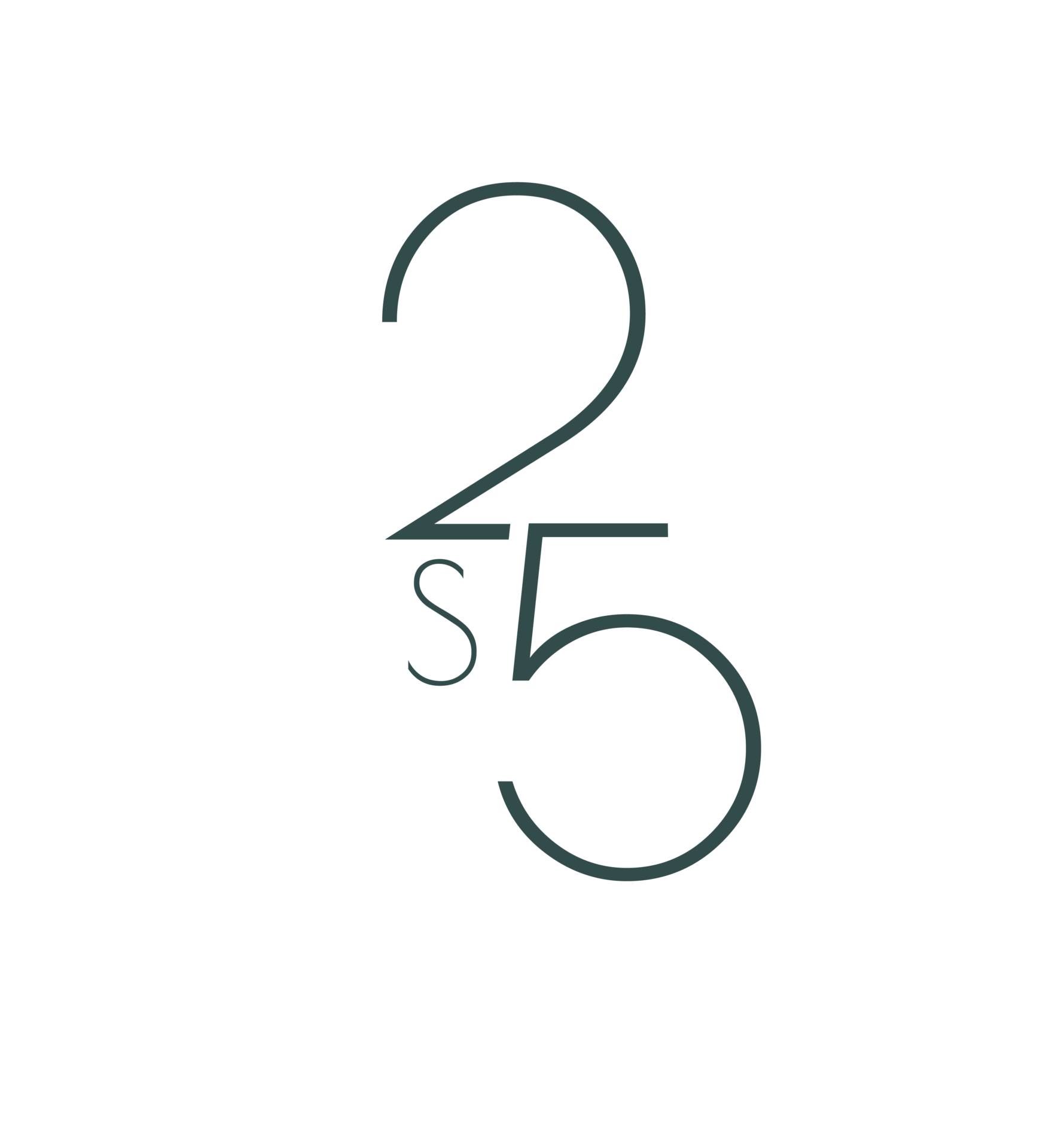 הלוגו של סטודיו 25 הוא המספרים עצמם – 25 – מעוצבים בקו עדין, רציף, כמעט קליגרפי.