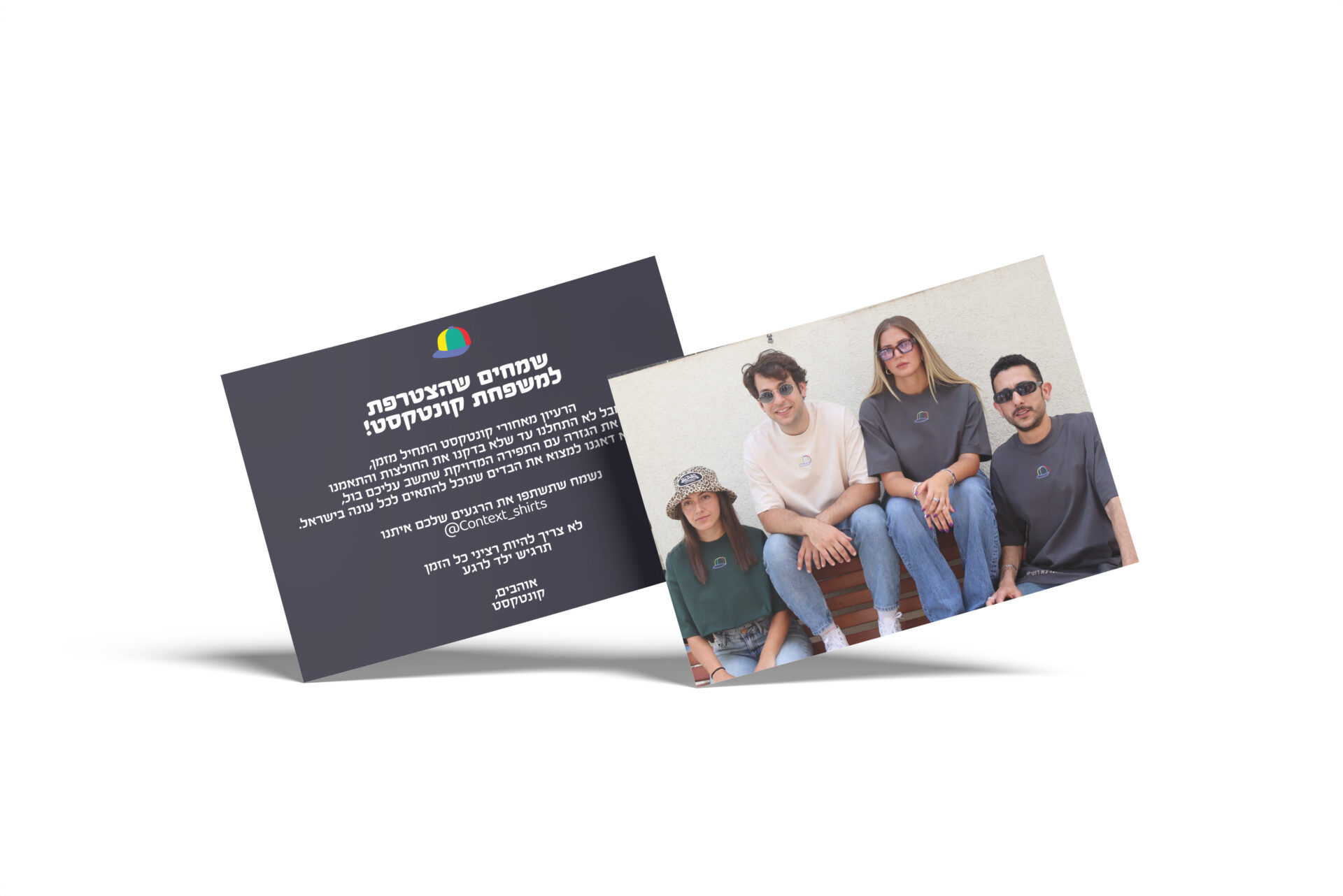 קונטקסט נולד מהרצון ליצור מותג אופנה ישראלי שמדבר על משהו יותר גדול מסתם בגדים. השם עצמו – "קונטקסט" – מבטא את הרעיון המרכזי: הבגד תמיד קיים בהקשר. ההקשר של מי שלובש אותו, איפה הוא נמצא, מה הוא רוצה להגיד.